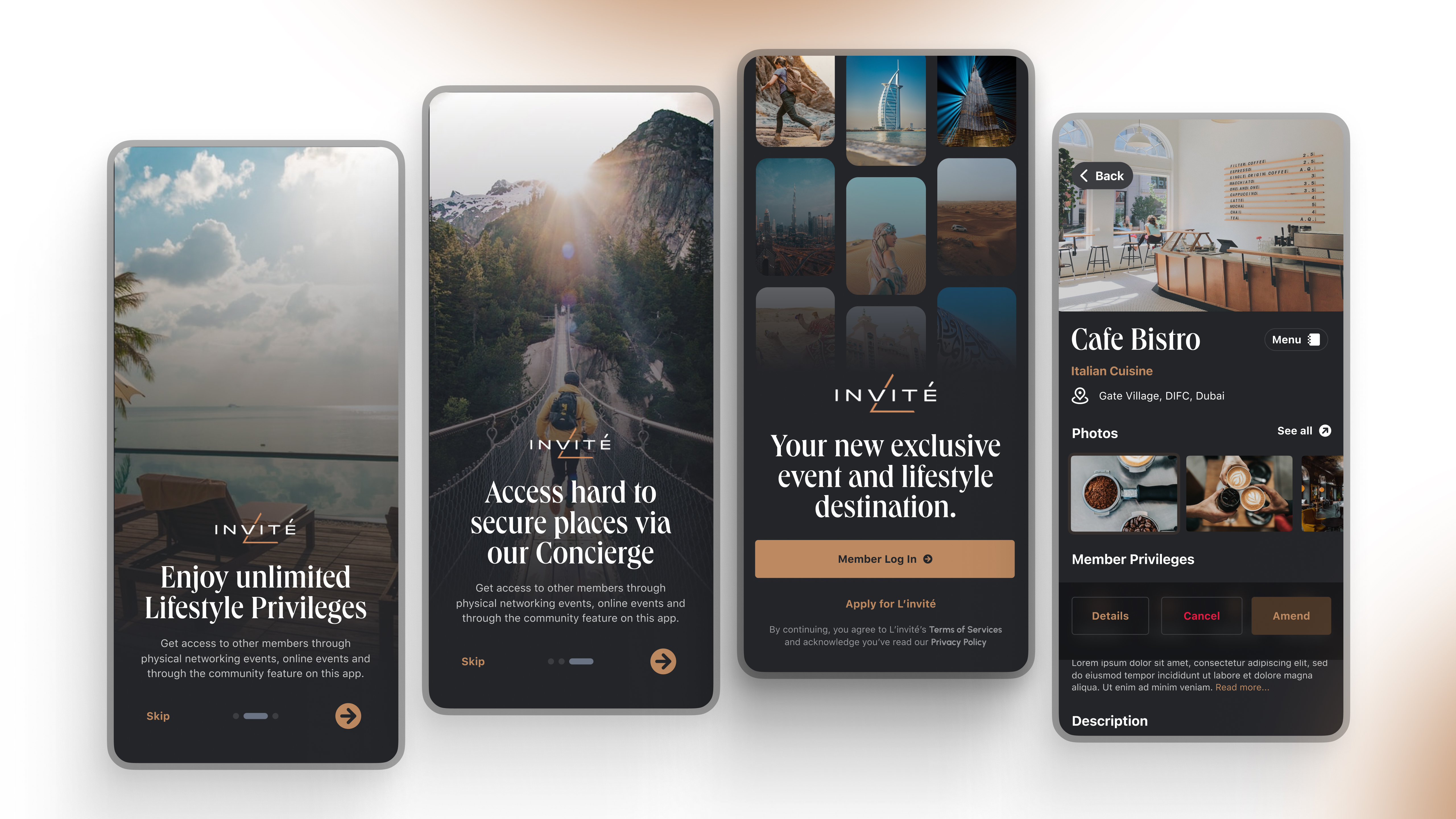 L'invité is a premium private network in the UAE, providing exclusive networking and lifestyle privileges to its selective members. It offers access to high-end events, luxury venues, and personalized concierge services, focusing on connecting like-minded individuals for both social and professional enrichment. The network combines exclusivity with global reach, enhanced by a dedicated digital app.